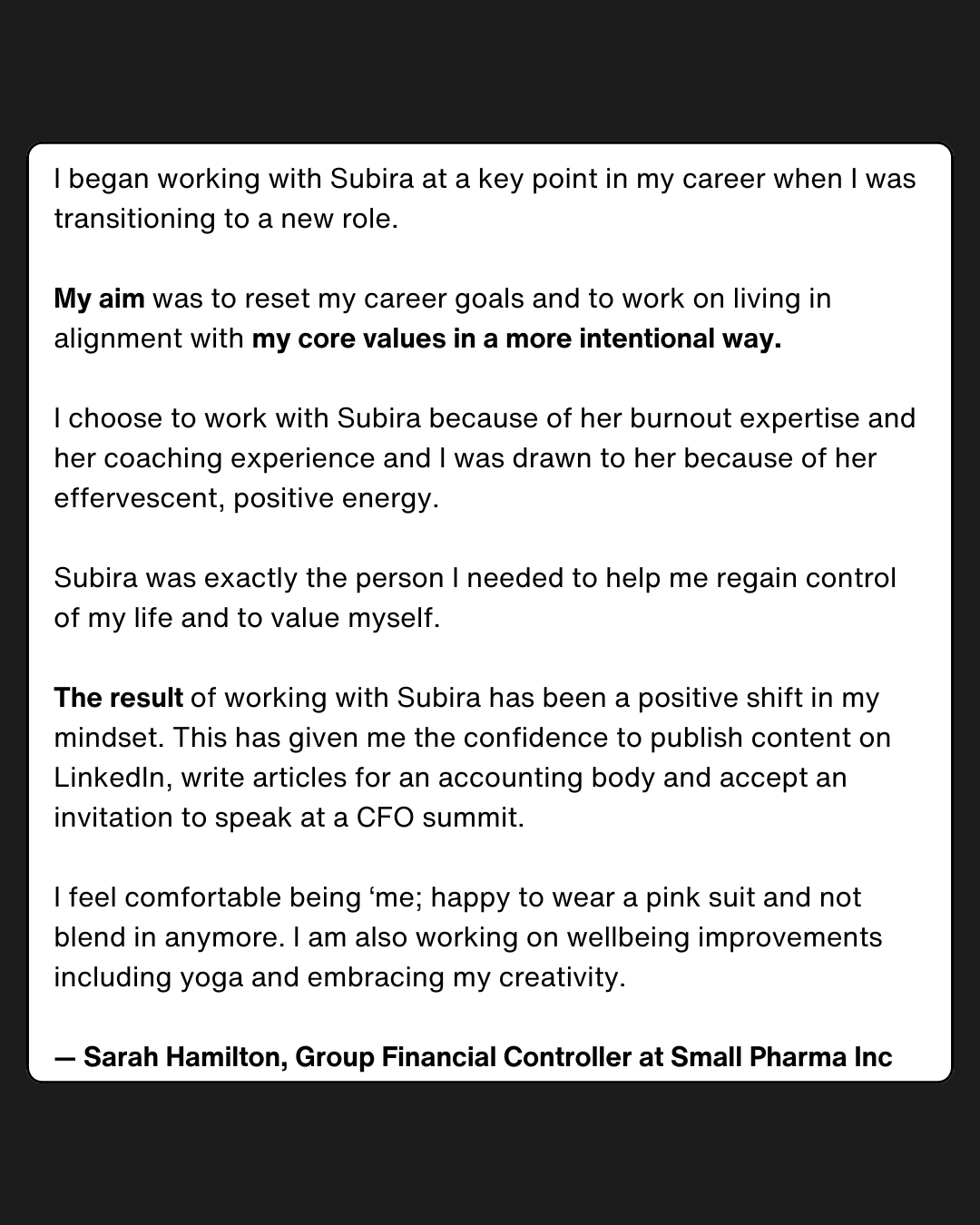 As a certified Life Coach, Subira works with professionals across different industries, supporting them achieve Work Life Success.