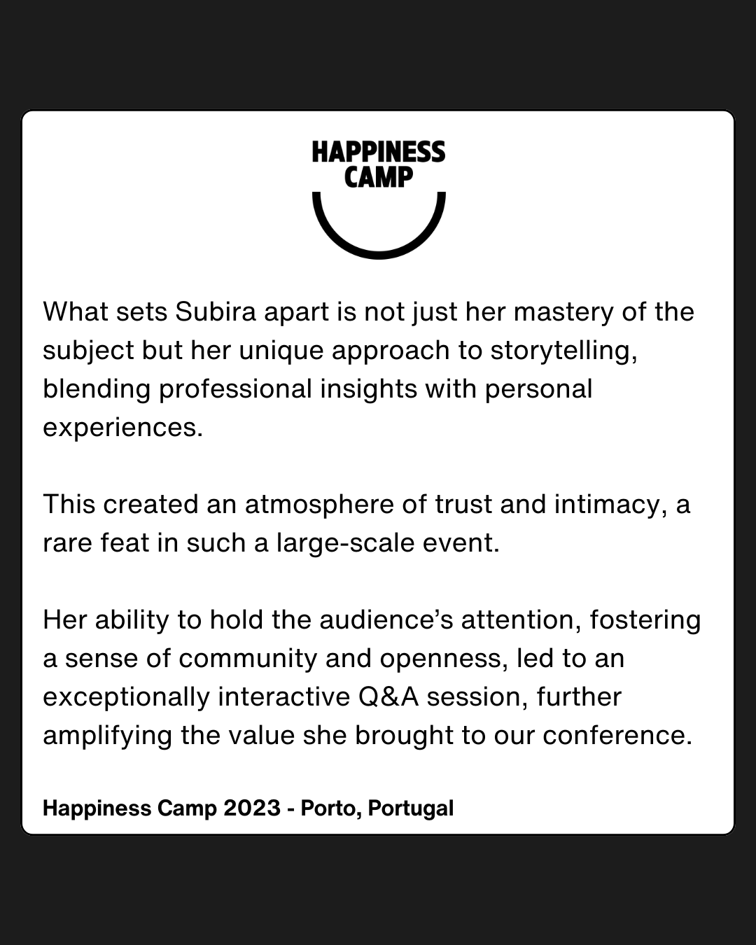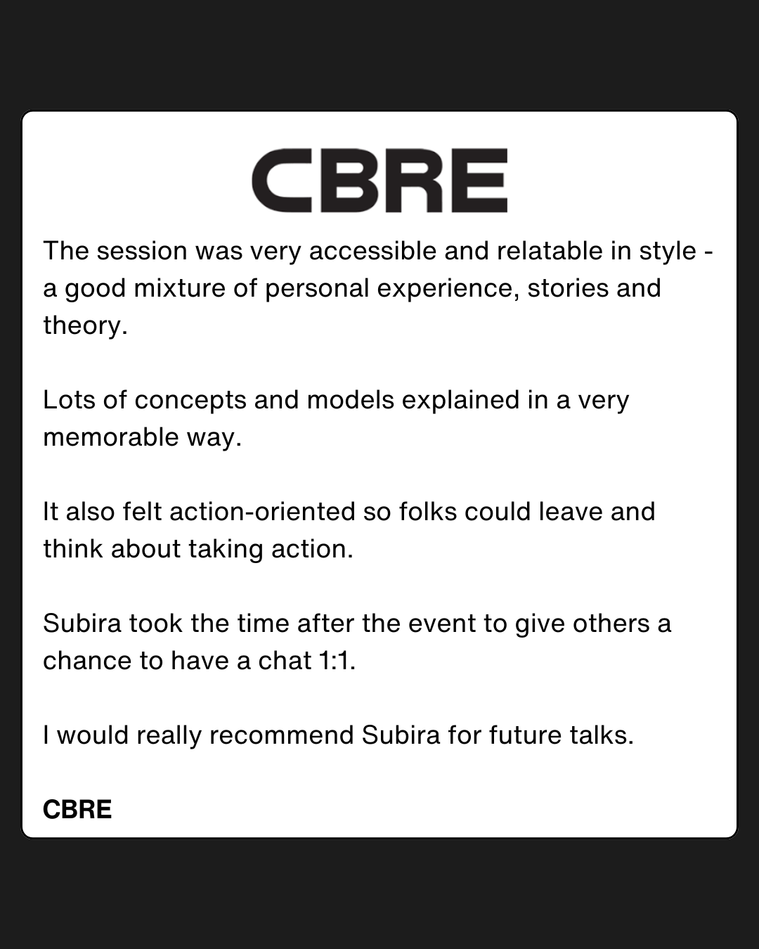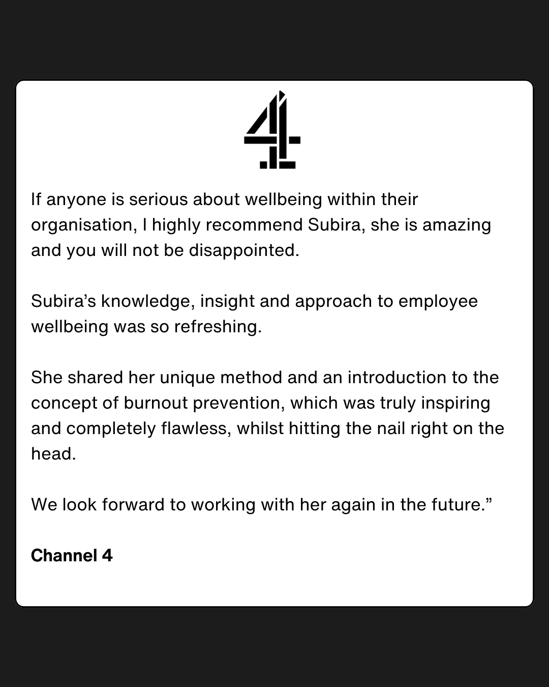 Working with global organisations, Subira has been invited to deliver talks and workshops for brands such as Fujifilm, Sky, Channel 4 and more, to educate, empower and equip their employees to redefine the way they Work and Live for sustainable success.